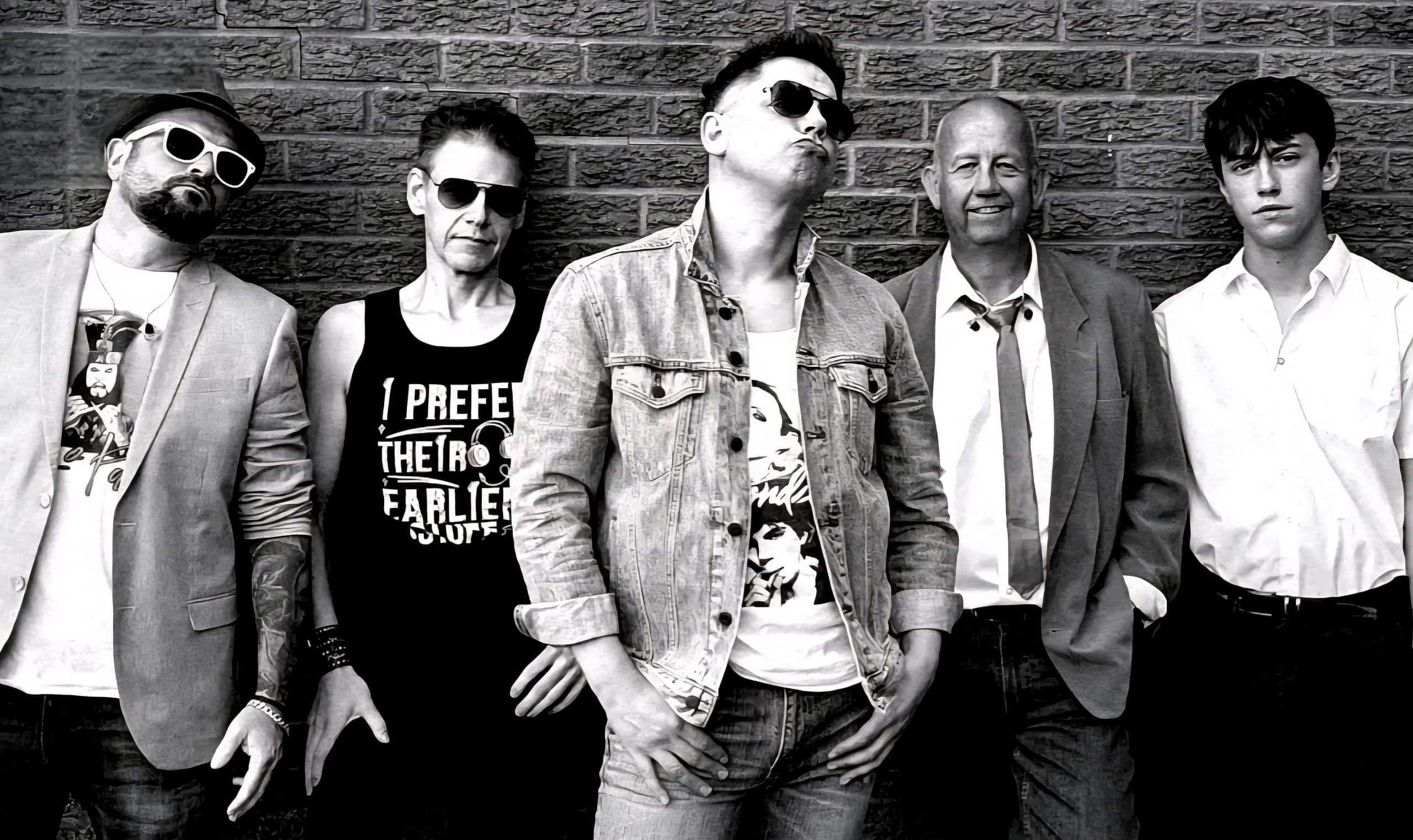 Regener8 band members posing in front of a brick wall in black and white. Each member showcases unique 80s-inspired style with sunglasses, graphic tees, and denim jackets.